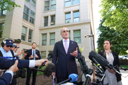 Israeli Ambassador to the U.S. Yechiel Leiter speaks with reporters outside of the State Department in Washington on Tuesday. (AP Photo/Jacquelyn Martin)