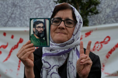 A woman holds a picture of the late Iranian Supreme Leader Ayatollah Ali Khamenei, who was killed in the U.S. and Israel strikes on Feb. 28, during a campaign in support of the government at the Enqelab-e-Eslami, or Islamic Revolution, Square in downtown Tehran, Iran, April 13. (AP Photo/Vahid Salemi, file)