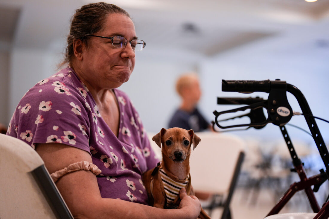 Jennifer Murphy and her dog Chip sit inside the Southside Baptist church as she is displaced by the Brantley Highway 82 fire, Friday, in Nahunta, Ga. (AP Photo/Mike Stewart)