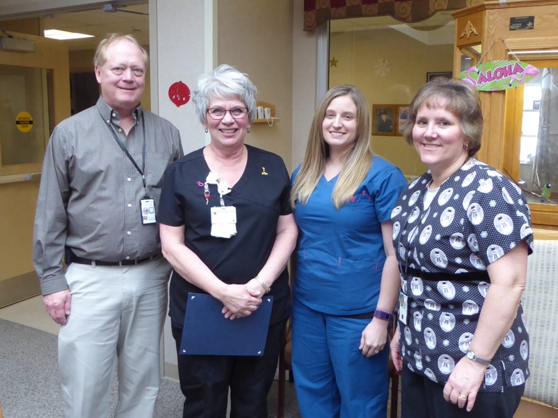 KATHY JO ANDERSON, RN, second from left, poses with her retirement certificate. She is shown here with, from left, Bob Peterson, NP, Geriatrics and Extended Care Service; Daniela DenBoer, RN, Community Living Center nurse manager; and Kim Nelson, CLC assistant nurse manager.