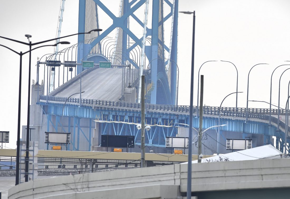 The Ambassador Bridge that connects the U.S and Canada is devoid of traffic Tuesday in Detroit. A blockade of the bridge by protesters demanding an end to Canada’s COVID-19 restrictions forced the shutdown Wednesday of a Ford plant. (Max Ortiz/Detroit News via AP)