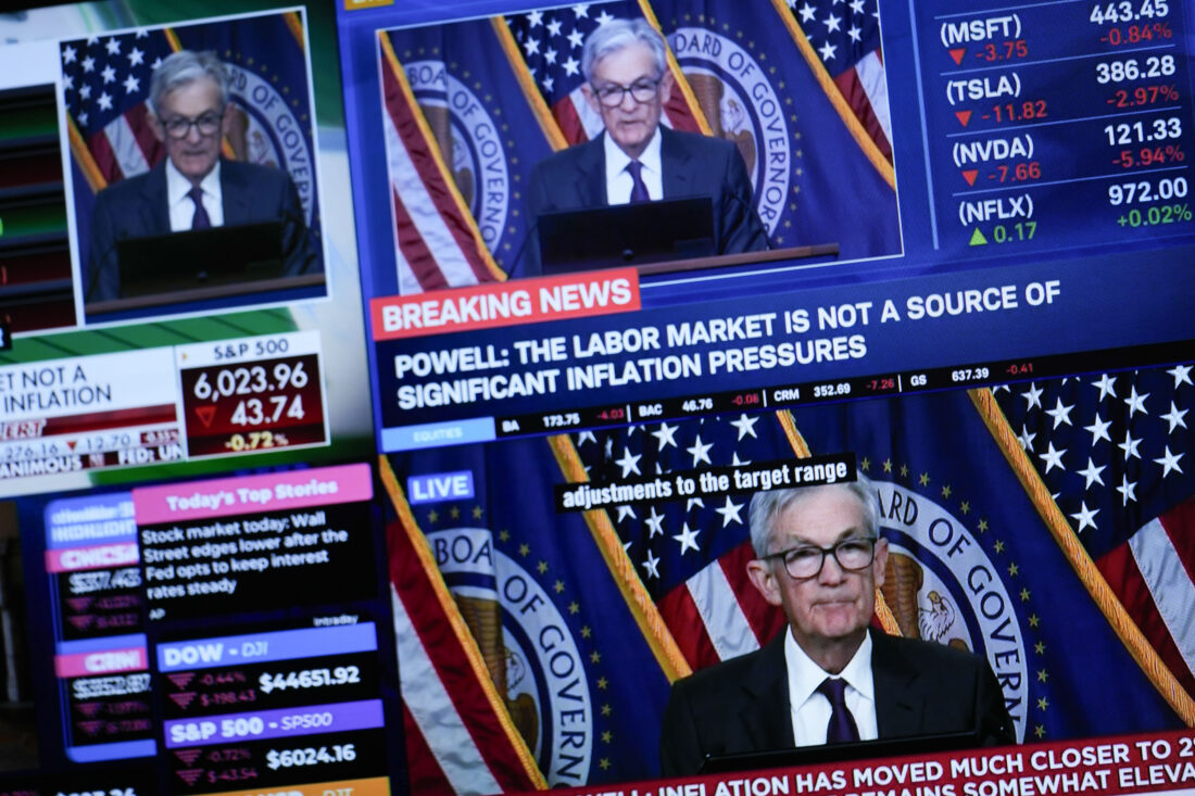 Screens display a news conference by Federal Reserve Chair Jerome Powell on the floor of the New York Stock Exchange in New York, Wednesday, Jan. 29, 2025. (AP Photo/Seth Wenig)