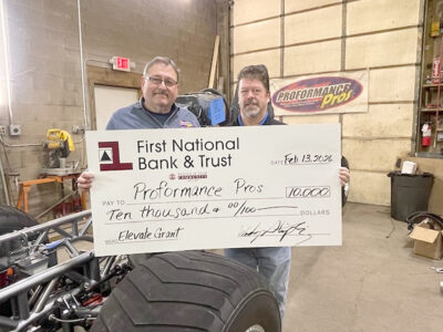 - Randy Kleikamp, owner of Proformance Pros in Carney, is shown receiving a $10,000 Elevate Small Business Grant from Wes Stripling of First National Bank & Trust’s Menominee market. The grant came through FNB from the Federal Home Loan Bank of Indianapolis. (Submitted photo)