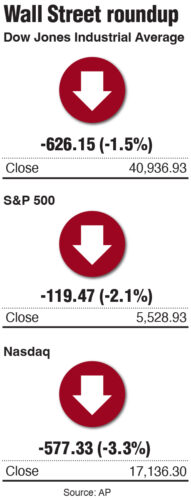 The S&P 500 sank 2.1% to give back a chunk of the gains from a three-week winning streak that had carried it to ...