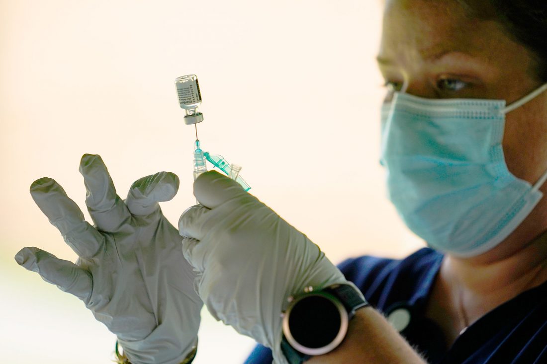 A syringe is prepared with the Pfizer COVID-19 vaccine at a clinic at the Reading Area Community College in Reading, Pa. (AP Photo/Matt Rourke, File)