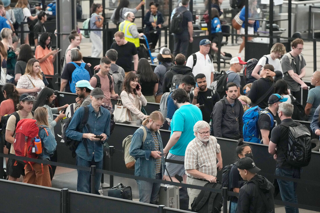 TRAVELERS WAIT IN long lines July 5 at a security checkpoint in Denver International Airport. The Fourth of July holiday weekend jammed U.S. airports with the biggest crowds since the pandemic began in 2020. (AP Photo/David Zalubowski)