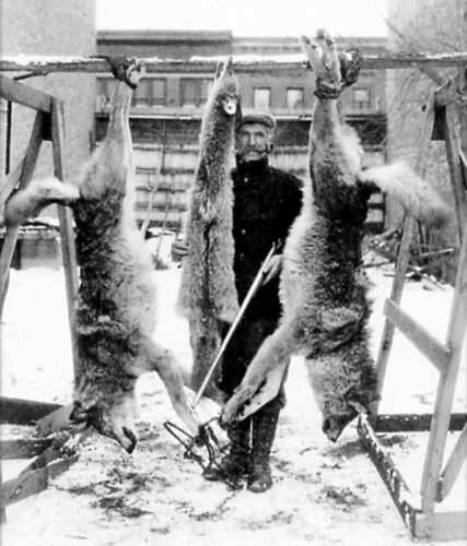 In this 1920s to 1930s photograph, Wilfred “Wolf” Habamer, a wolf hunter from Waucedah, poses with three timber wolves.