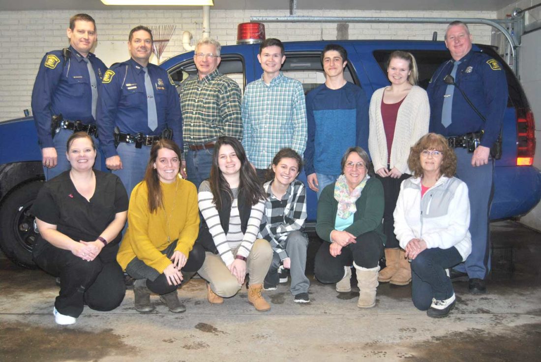 KINGSFORD HIGH SCHOOL students participated in a mock exercise using Critical Incident Stress Management (CISM) with the Michigan State Police Post in Iron Mountain. Shown here in front from left are Jeananne Sheltrow, Elyse Damico, Alissa Kainrath, Nicci Hofer, Anita Leeman, and Lisa Woods. In back from left are Trooper Steve Boyer, Trooper Geno Basanese, Joe Hruska, Mitchell Wiltzius, Dominic Occhietti, Chloe Gabbert and Trooper Scott Ritsema.