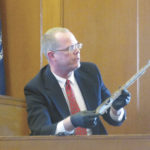 SGT. JAMES BUCK, a firearms examiner with the Michigan State Police, shows jurors Tuesday the portion of a .22 rifle investigators found in the Caspian pit in May 2016. He was unable to get much information from the gun, as the serial number had been scratched off and the firearm was inoperable. Authorities said Kelly Cochran admitted throwing the gun in the pit after the October 2014 killing of Christopher Regan. (Nikki Younk/Daily News photo)