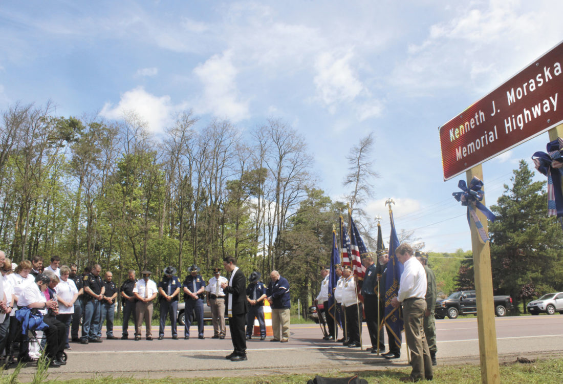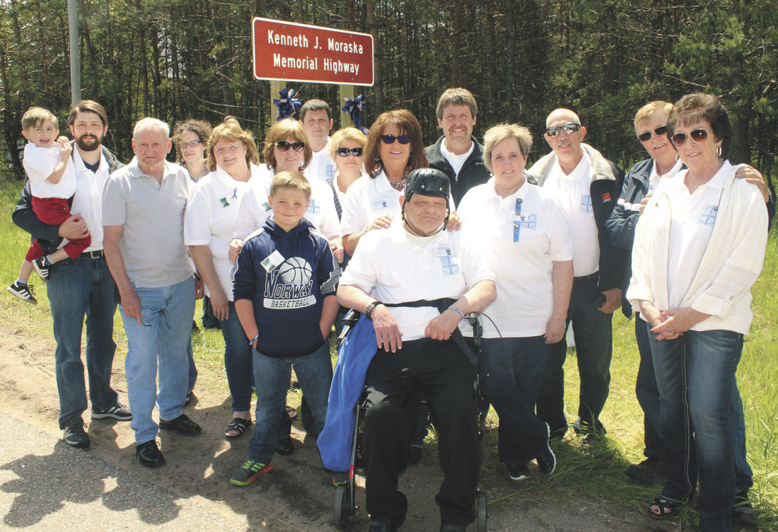 Family, friends, local officials and law enforcement officers were among those who helped unveil new signs in a ceremony Wednesday afternoon marking U.S. 2 through Norway as the Kenneth J. Moraska Memorial Highway.