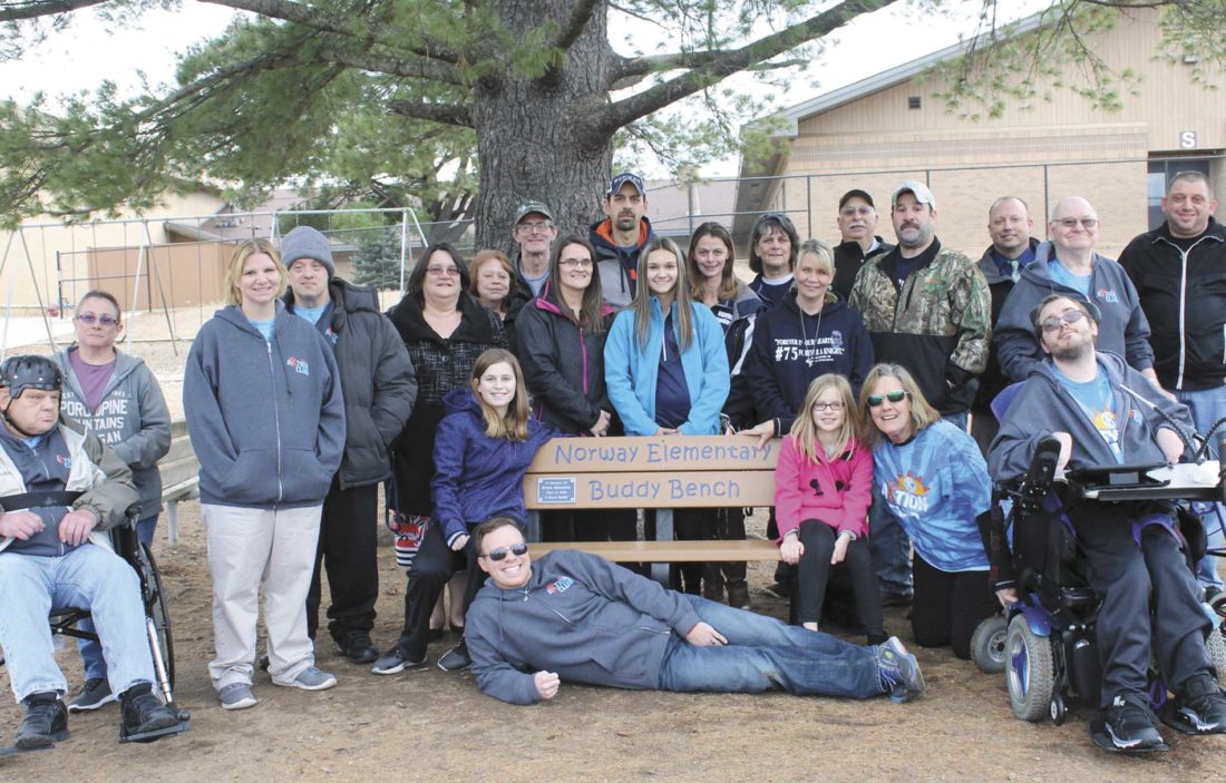 Pictured are members of the Kiwanis Aktion Club, along with relatives of the late Bryan Stanchina, at a dedication Friday of the new Buddy Bench at Norway Elementary School. The bench was built in memory of Stanchina who drowned in the Menominee River in June while coming to the aid of another swimmer. In back, from left, are John Moraska, Meg Taff, Sheena Bobnock, Steve LaRock, Renee Stanchina, Crystal Loesch, Gordon Loesch, Tabitha Stanchina, Chris Stanchina, Olivia Stanchina, Amber Stanchina, Valerie Stanchina, Kristi Allen, James Stanchina, Joe Stanchina, Rico Meneghini, Brad Annula, Brian Nord and Brad Reynolds. In front are Kelly Stanchina, Jonathan Ringle, Cara Stanchina and Barb Reisner. Theresa Proudfit/Daily News Photo