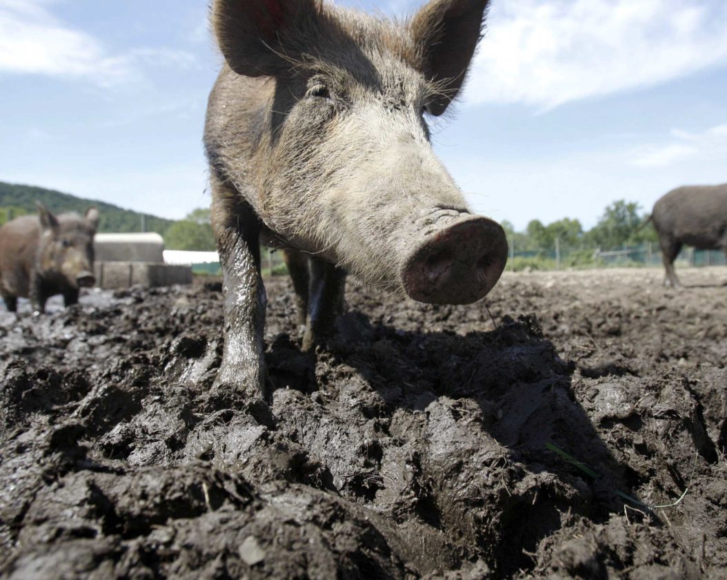 A FERAL HOG in a holding pen at Easton View Outfitters in Valley Falls, N.Y. in 2011. New York has since eradicated feral swine within its boundaries. (AP Photo/Mike Groll, File)