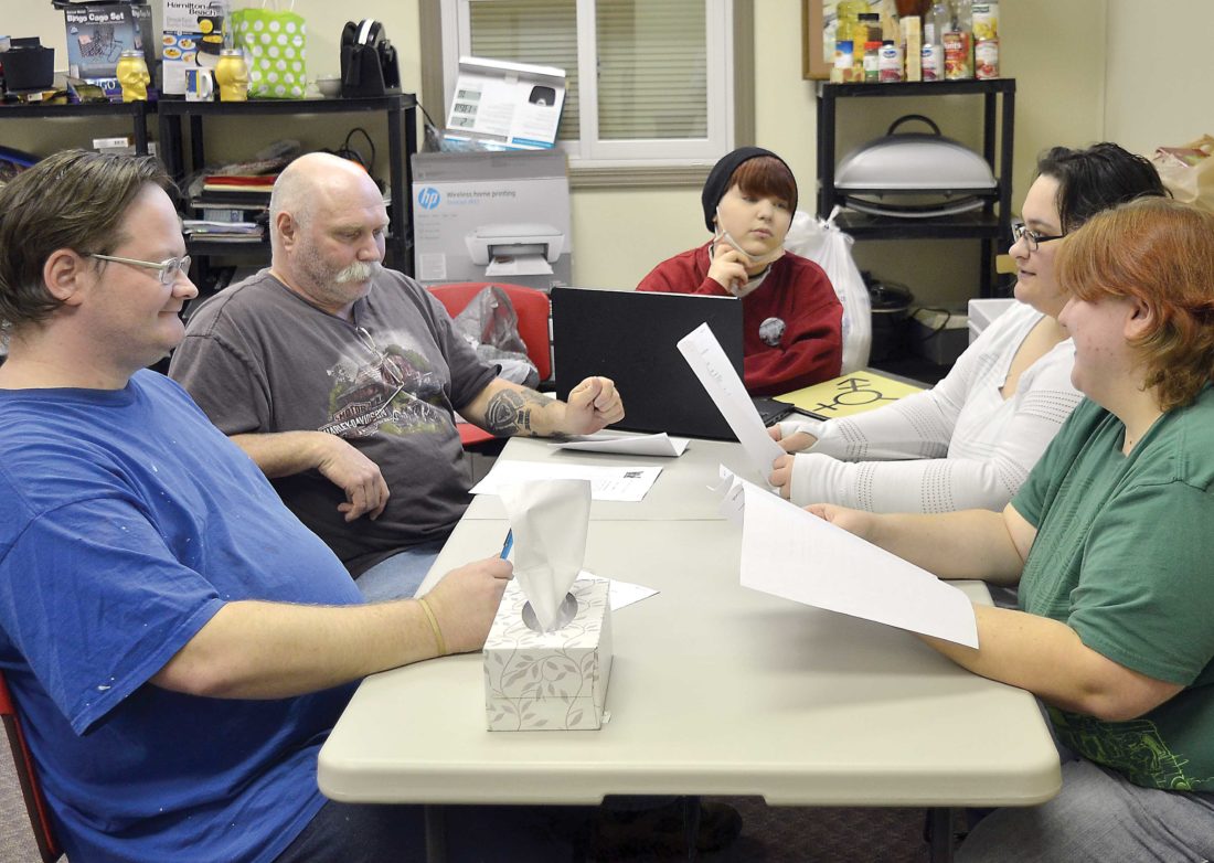From left are Robert Losiniecki, Forever Friendship Drop-In director and certified peer support specialist Patrick Flynn, Phebian Sky, Amy Hall and Jessie Pike. (Terri Castelaz/Daily News Photos)