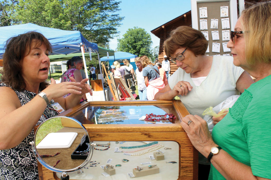 Marcy Frayseth of Silver Cliff Designs of Green Bay discusses a piece of her custom-designed jewelry with Gina Ferris of Florence, Wis., and Mary Schroeder of Merriman during the 51st annual Art for All event Saturday at City Park.