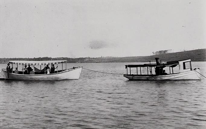 (William J. Cummings) As early as the summer of 1891, Dick Flaherty provided excursions around Lake Antoine in his steam yacht and had a fleet of 14 small boats to rent for picnic parties. Lake Antoine’s Shady Island resort was established by Theodore Firme in the summer of 1896. Pictured is the steam yacht and boat that transported picnickers from the shore to the island.