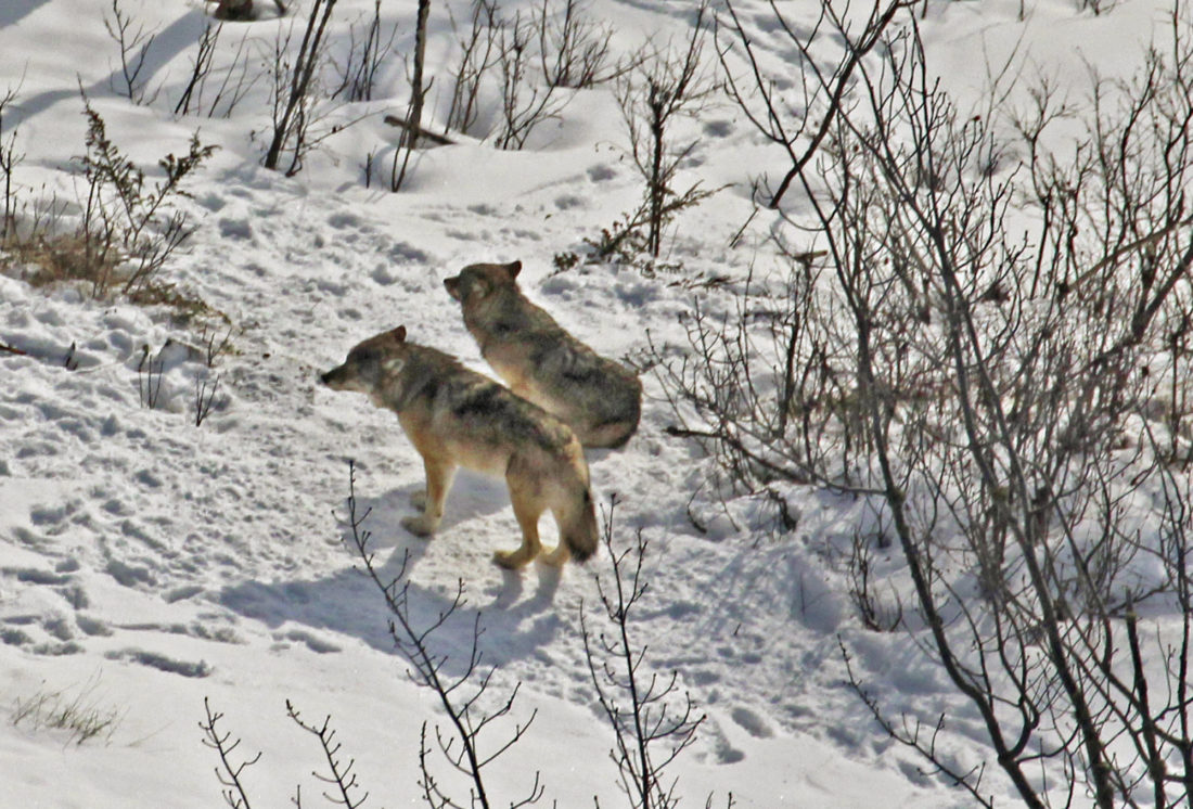This 2017 photo provided by biologist Rolf Peterson of Michigan Technological University shows the last two surviving wolves at Isle Royale National Park in Michigan. The National Park Service plans to relocate additional wolves to the Lake Superior park in coming years to rebuild the predator species' depleted population. (Rolf Peterson/Michigan Technological University via AP)