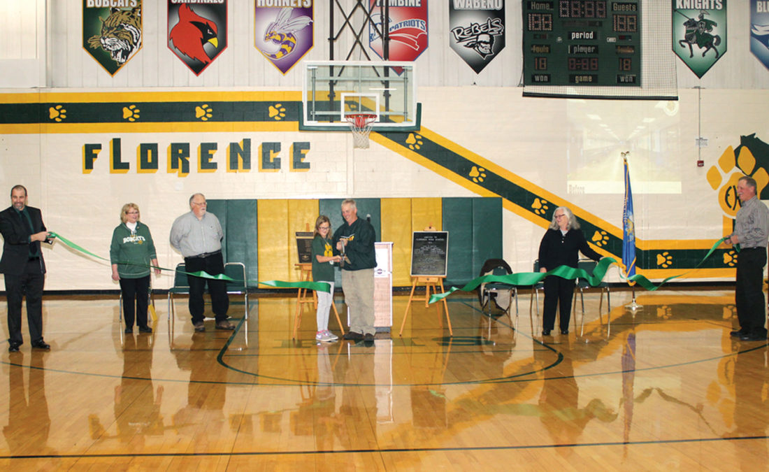 The School District of Florence County and the greater Florence County community recently held a ribbon cutting and dedication ceremony for the new middle/high school addition and renovation. From left, in the high school gymnasium are Ben Niehaus, district administrator; Deb DeMuri, facility task force member; Ron Yadro, board clerk; fifth grader Samantha DeMuri; Don Dumke, school board president; Linda Opsahl, board member; and Jim Churchill, board treasurer.