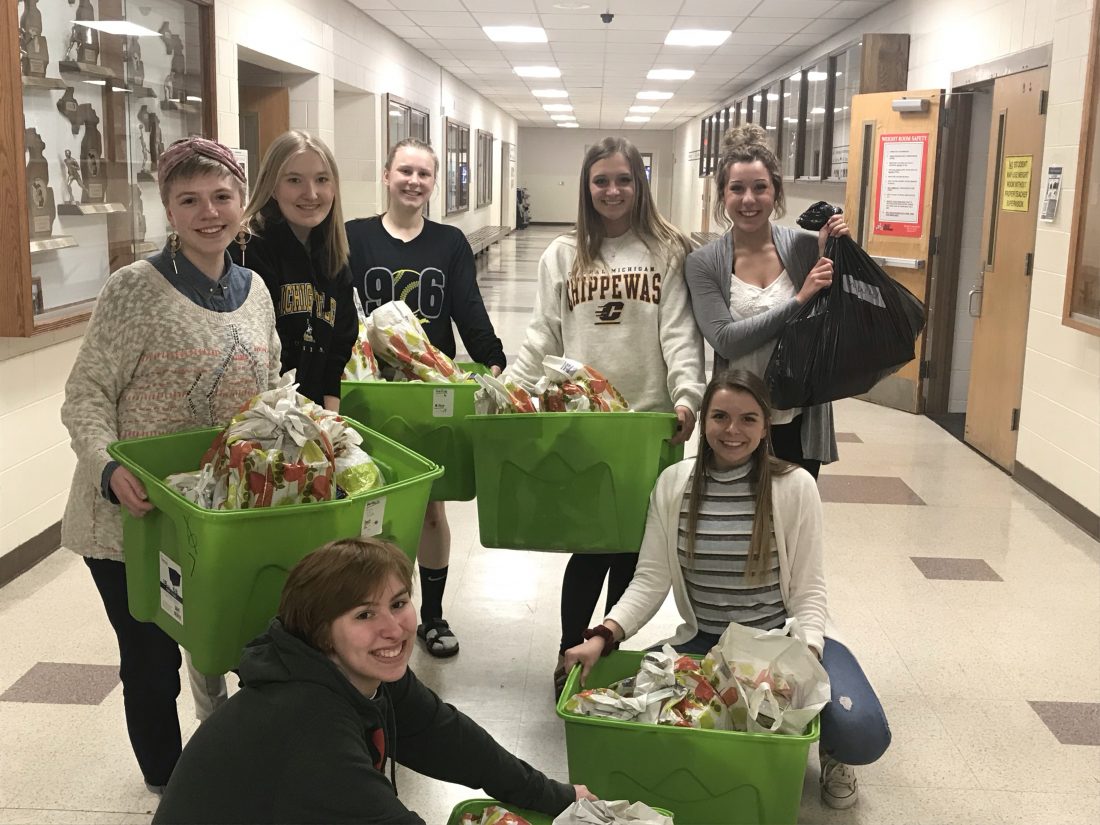 Norway High School National Honor Society members recently helped with food distribution as part of the Grace United Lunch Packs, or GULP, program. Students participating in the program receive bags packed with two breakfasts, two lunches, two snacks and a can of fruit or vegetables at the end of each week to take home over the weekend. Honor Society members volunteering were — in front, from left, Emilie Rake and Allison Sheski; in back, Anna Anderson, Amanda Bekkala, Ada VanHolla, Haley Clifford and Holly Mattia.