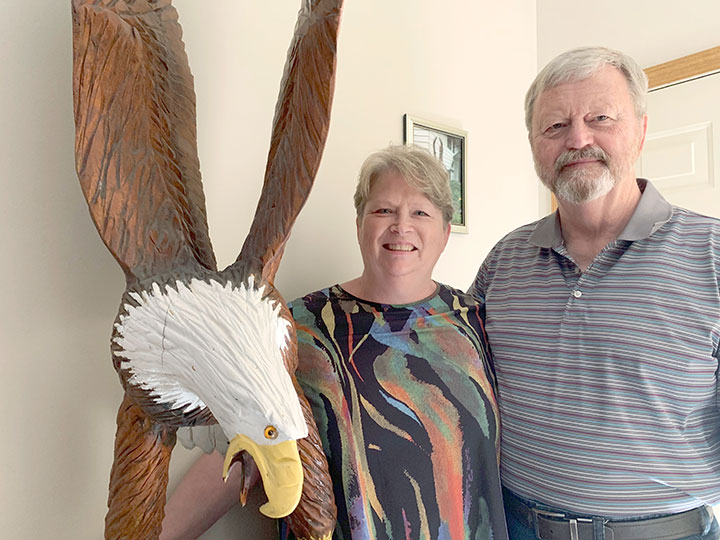 VICKI AND LARRY EKLUND pose with their 7-foot-tall bald eagle carving at their home in Coon Rapids, Minn. When the Eklund's 150-pound bald eagle carving was stolen from their yard earlier this year, police in the Minneapolis suburb had a key piece of evidence: an image of the suspect looking directly into Eklund’s doorbell camera. Police posted the Ring doorbell video on social media, and hours later the Army veteran's valued carving was returned. (AP Photo/Jeff Baenen)