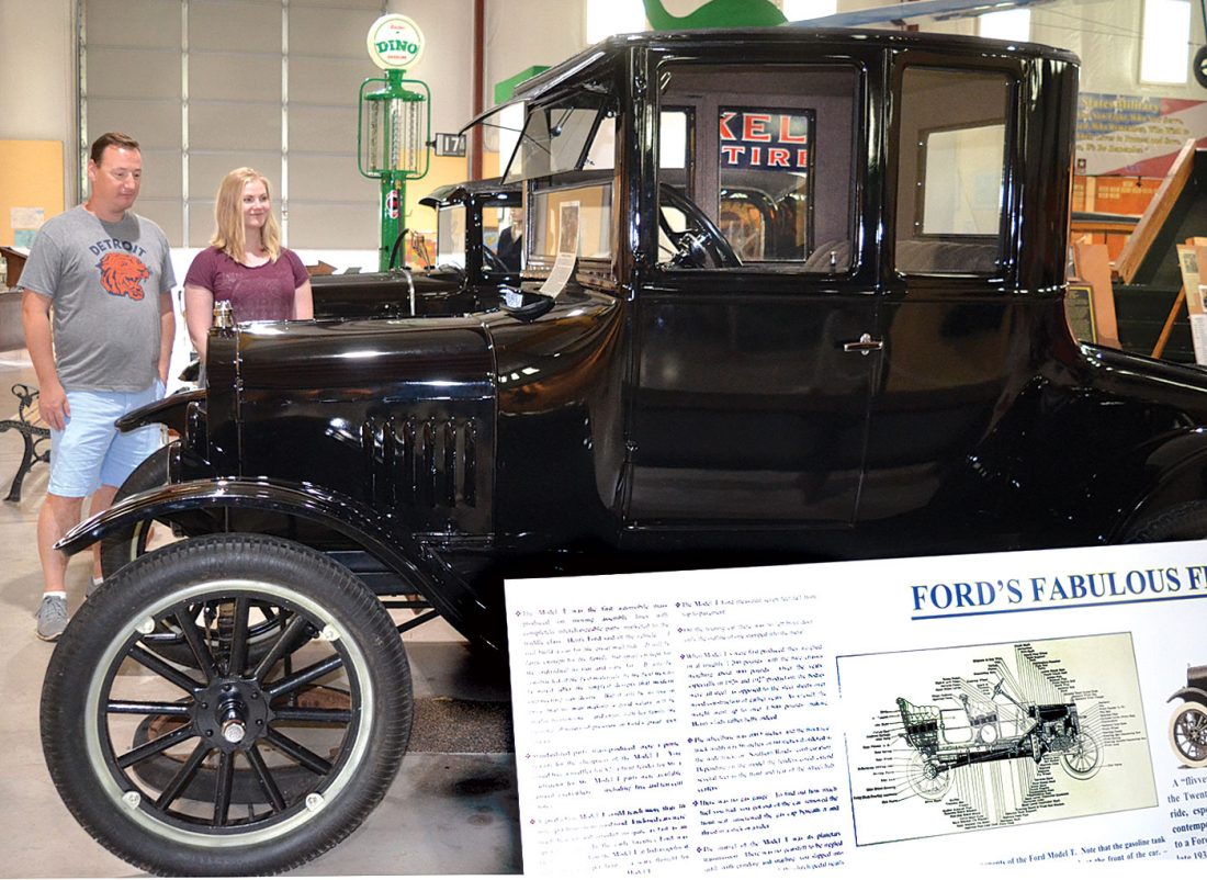 - Brian and Lauren Elder of Farmington Hills, Mich. check out the 1924 Model T Ford coupe that is now on display at the World War II Glider and Military Museum in Iron Mountain. (Terri Castelaz/Daily News photo)