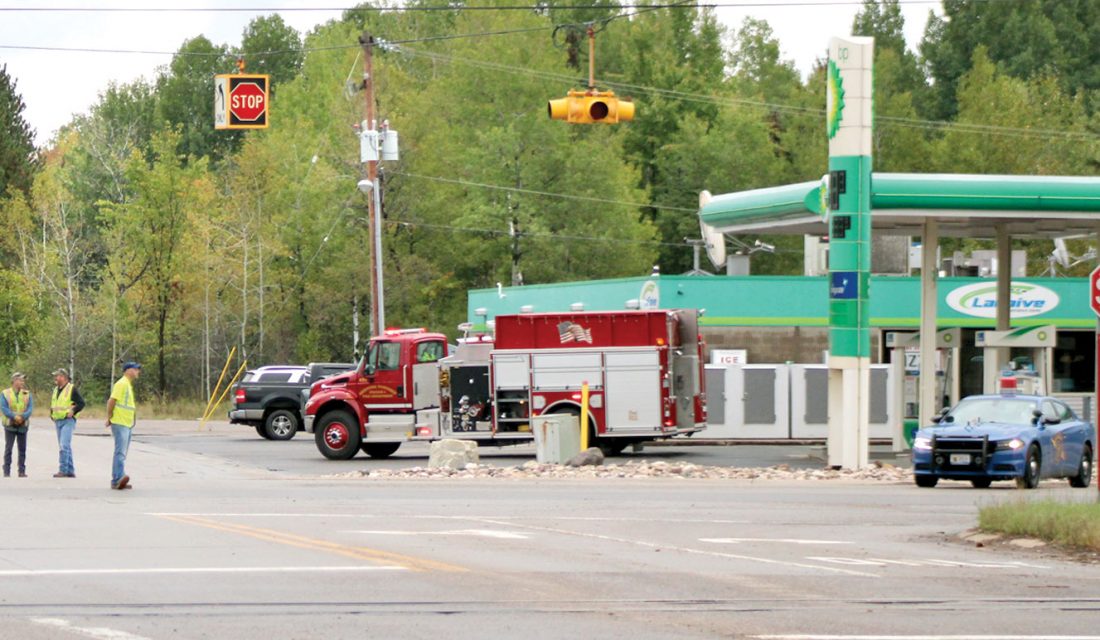 CREWS REROUTE TRAFFIC and work to clear M-95 after a fatal crash Monday at the M-69 intersection in Sagola. (Theresa Proudfit/Daily News photo)