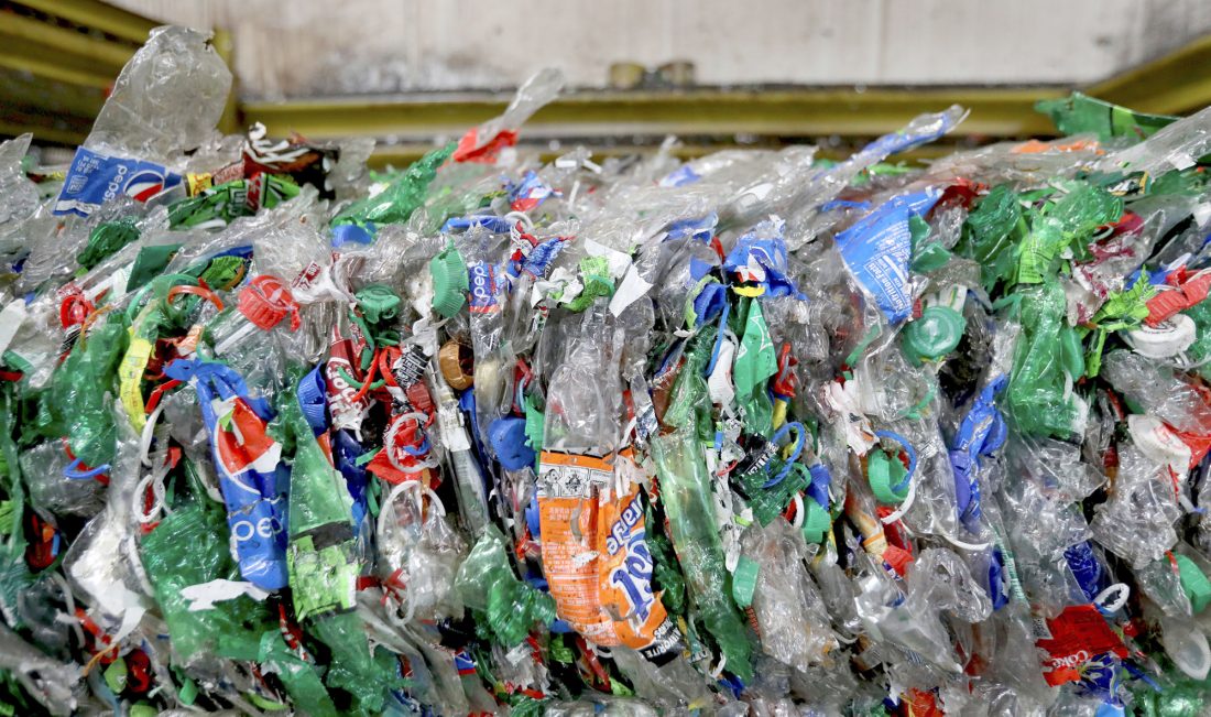 FLATTENED PLASTIC BOTTLES in one area of Schupan Recycling in Wixom, Michigan, have been sitting for the past two months with nowhere to go. Most of the recycle center has not been active because of the coronavirus and people not being able to recycle bottles at grocery stores which end up coming here for processing. (Eric Seals/Detroit Free Press via AP)