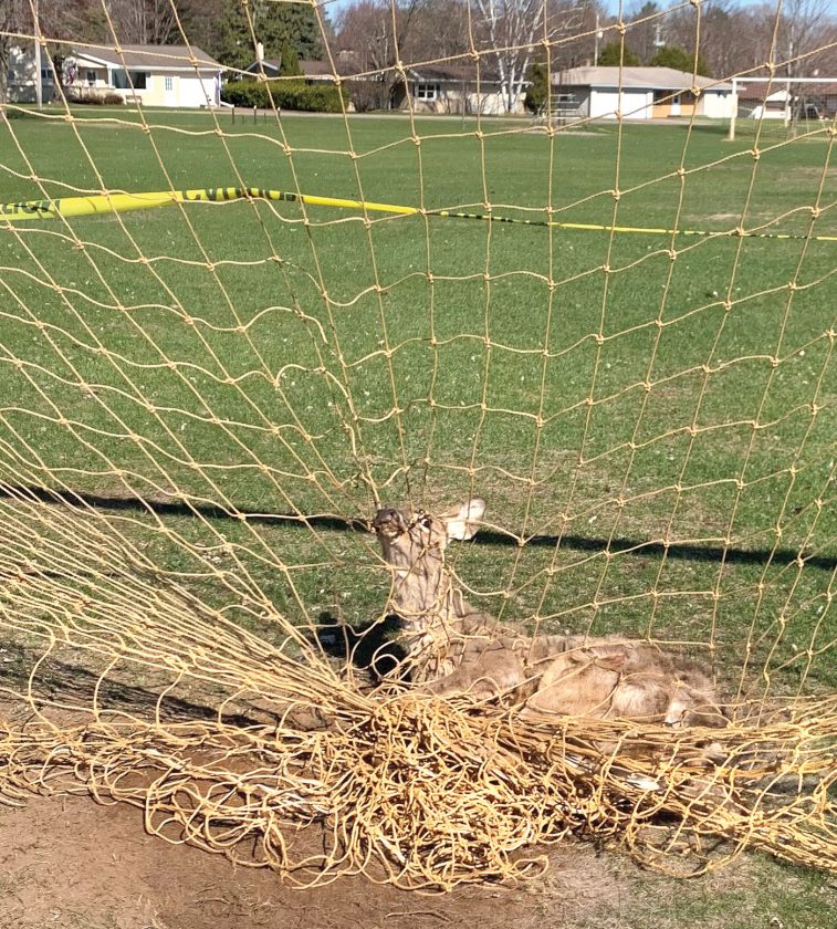 - CITY EMPLOYEES IN Niagara, Wis., on Wednesday morning found this doe wound tightly in a soccer goal net at Heights Park. They were able to cut the deer free and let it go. (Audrey Fredrick photo)