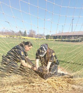 NIAGARA POLICE CHIEF Angela Moreau and Officer Heather Romback work to free a deer that became ensnared in a soccer goal net. (Audrey Fredrick photo)