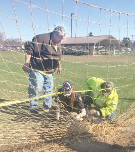 Niagara Public Works employees John Henrichs, left, and J.J. Coppens, right, work with Niagara Police Officer Heather Romback, center, to free a deer that became entangled in a soccer goal net at a city park in Niagara, Wis. (Audrey Fredrick photo)