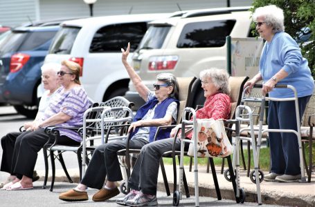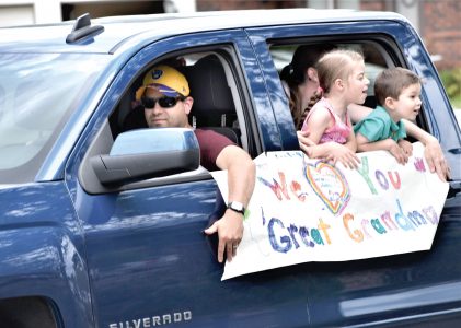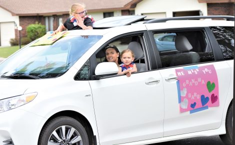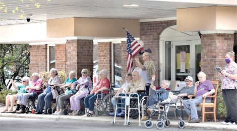 Evergreen Senior Living in Kingsford had a parade for residents Monday afternoon that allowed family members to mark the Memorial Day holiday and “come and have a social distancing visit … which they haven’t had for a some time,” said Chip Anderson, administrator. The assisted living center has not allowed visitors during the COVID-19 stay-at-home order. Residents lined up outside the center’s entrance to view the vehicles as they went by.