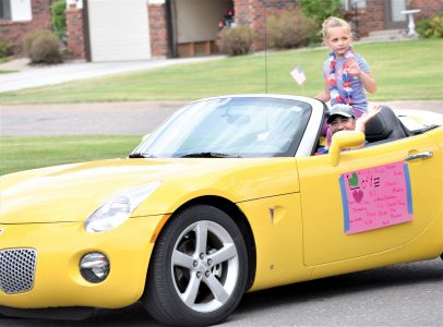 Evergreen Senior Living in Kingsford had a parade for residents Monday afternoon that allowed family members to mark the Memorial Day holiday and “come and have a social distancing visit ... which they haven’t had for a some time,” said Chip Anderson, administrator. The assisted living center has not allowed visitors during the COVID-19 stay-at-home order. Isabelle Shaker gets a ride from dad Clay Shaker. (Betsy Bloom/Daily News photo)