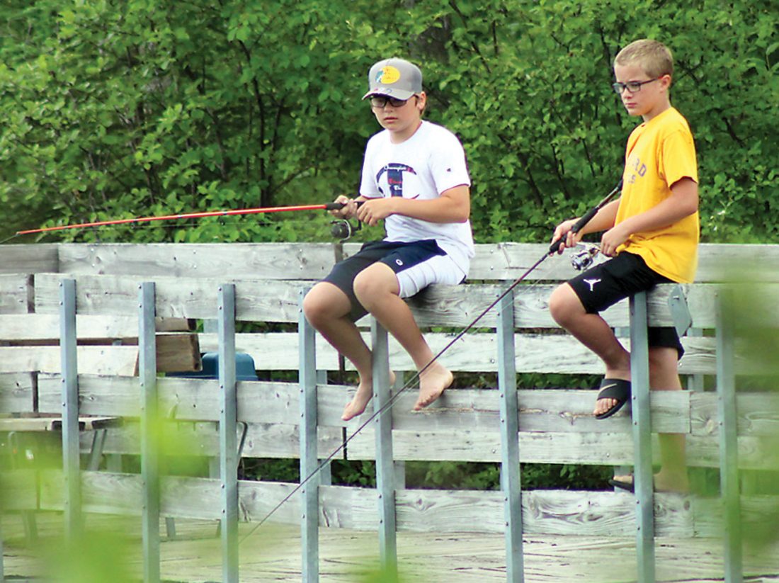 Tanner Miller, left, and Logan Milliron, both of Iron Mountain, fish off the dock at Cowboy Lake in Kingsford on Wednesday. The Michigan Department of Natural Resources has declared this coming weekend to be a free fishing weekend in the state.