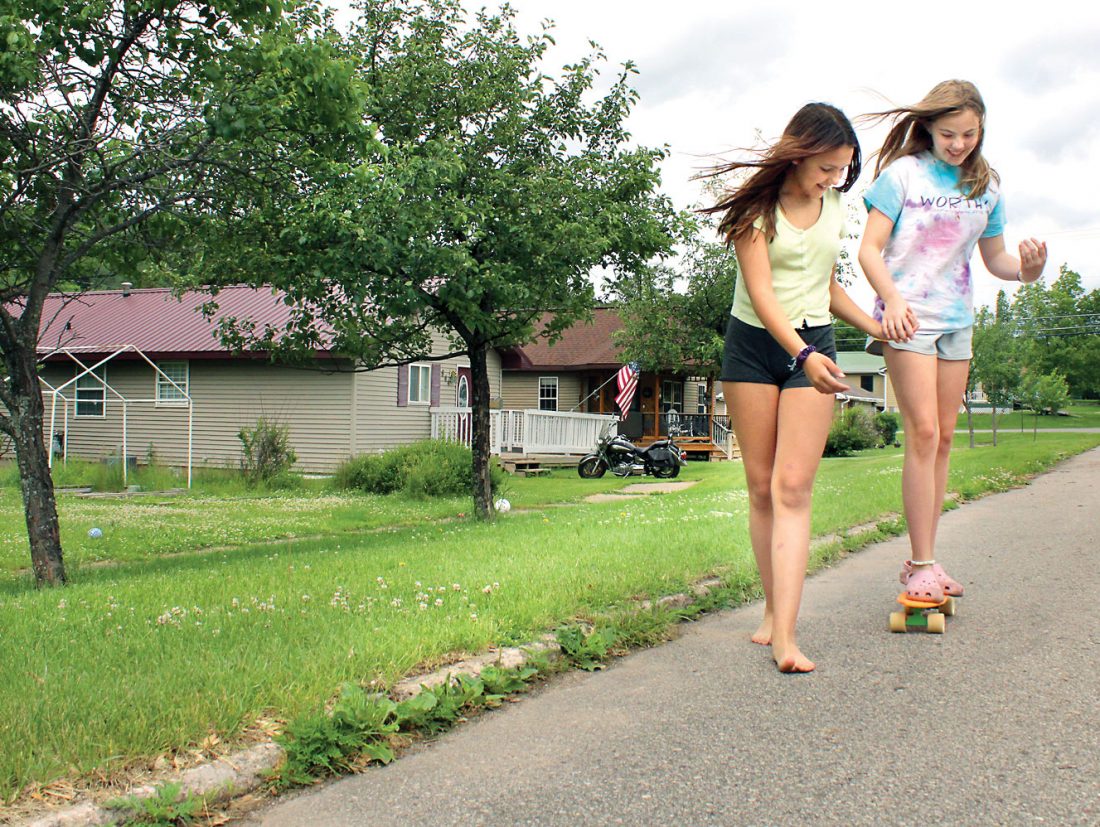 Alivia Chandler, left, of Iron Mountain helps her friend Mira Schneider of Kingsford ride a skateboard down East D Street in Iron Mountain on Tuesday afternoon.