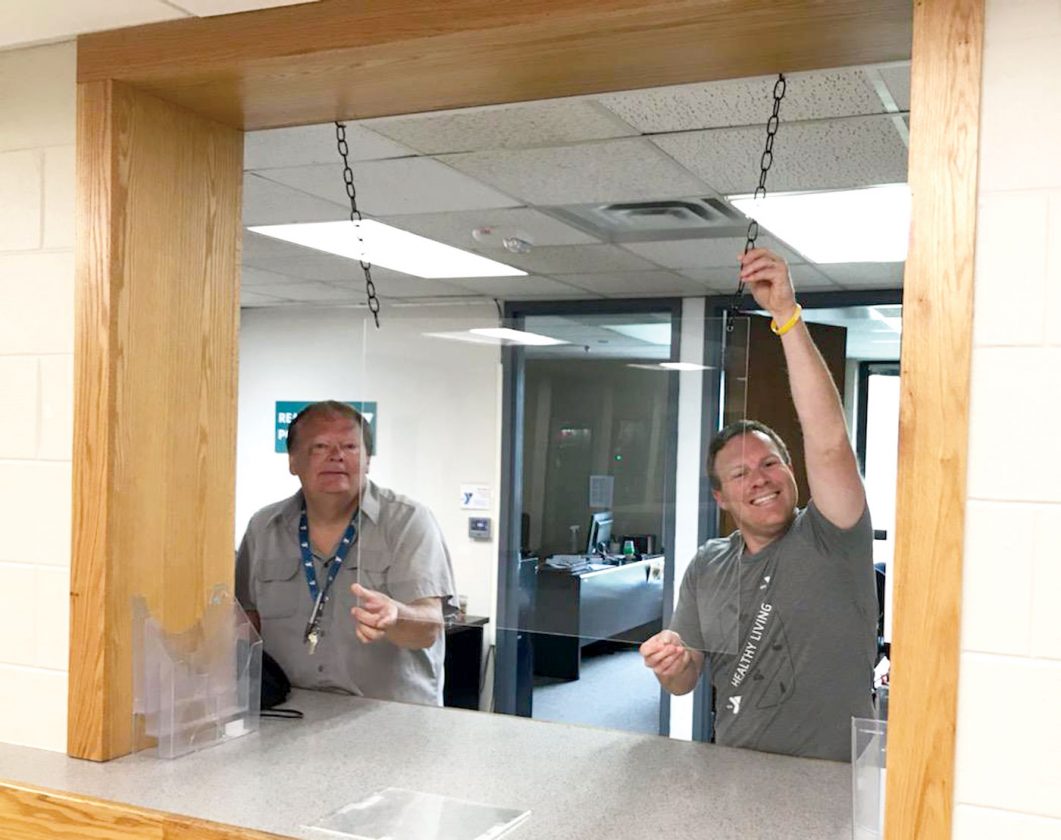 FROM LEFT, NORTHERN LIGHTS YMCA maintenance director Greg Hendricks and Center Director Jonathan Ringel inspect a piece of plexiglass that was hung at the front counter as part of the facility’s effort to prevent the spread of coronavirus. (Ron Deuter photo)