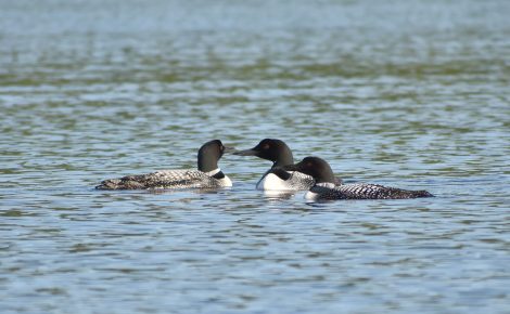 Three apparently wasn’t a crowd for this trio of adult common loons hanging out together at Six Mile Lake in northern Dickinson County. While loons normally are solitary or in breeding pairs, this is late enough in the nesting season that the territorial urges might be relaxing, especially for non-breeding adults.