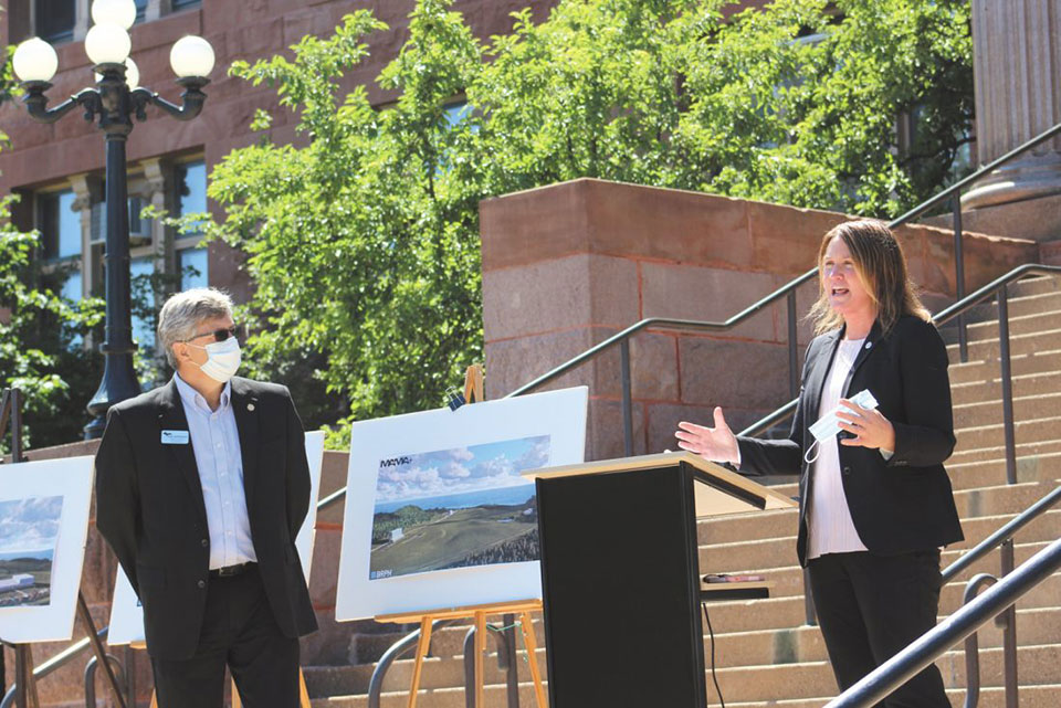 STATE REP. SARA CAMBENSY, D-Marquette, at a news conference Thursday at the Marquette County Courthouse in Marquette as former state senator Tom Casperson, left, looks on. Officials on Thursday announced that K.I. Sawyer in Marquette County was selected in as the Michigan Aerospace Manufacturers Association’s vertical spaceport launch site and a site in Chippewa County was chosen as the autonomous vehicle proving grounds. (Lisa Bowers/Mining Journal photo)
