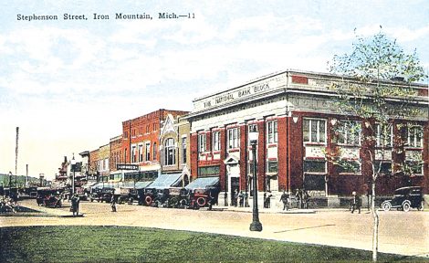 This postcard view of the 400 block of S. Stephenson Ave., taken in about 1925, shows: 401, Liberty Candy Kitchen (George Villenette); 403 – no listing; 405, Charles E. Parent Clothing Store in the Taylor Building (S.S. Kresge Co. opened at 405 on Nov. 17, 1926); 407-409, the Stern & Field (Herbert Field and Noe Bertrand); 411, no listing; 413 – no listing; 415-417, Levy-Unger Company, Ltd. (Henry M. Levy, Albert Levy, Isaac Unger); 421, Erickson & Johnson Grocery Store (Sol E. Erickson and Gust P. Johnson); The Hub Clothing Company (David J. Confeld and Meyer Rosenblum) opened at 421 in late March, 1925; 427-431, The National Bank Block. Most of the listings are from the 1925 directory. There were no buildings on the west side of the 400 block of Stephenson Avenue at this time. (William J. Cummings)