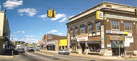 This postcard view, taken sometime after the fire of Feb. 28, 1982, when the center portion of the block was destroyed, shows: 403-405, S.S. Kresge Co. Variety Store; 407, Kresge-Khoury Building, Dear John’s Tavern (John Jacobs); 411, Western Auto (Don Christy); 421, Isabel’s (Mose Pasten and Isabel K. Pasten), women’s clothing; 425-427, Downtown Plaza, containing Wishing Well Gifts (Don Khoury and Sharon Khoury), Ace Drug Store (Rene Savoie). (William J. Cummings)