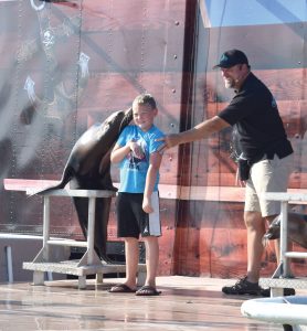 The 2020 Marinette County Fair officially opened Thursday in Wausaukee, Wis. Brodee Conlon, 9, of Green Bay, Wis., gets a kiss during the Sea Lion Splash Show at the fair. Shows today are at 4 and 6:30 p.m. The fair runs through Sunday, with admission $5 daily. Grandstand events include the farm tractor pull at 7 p.m. today, the demolition derby at 1 p.m. Saturday and the supermodified truck and tractor pull at 7 that evening. Live bands also will play. (Marguerite Lanthier/Daily News photo)