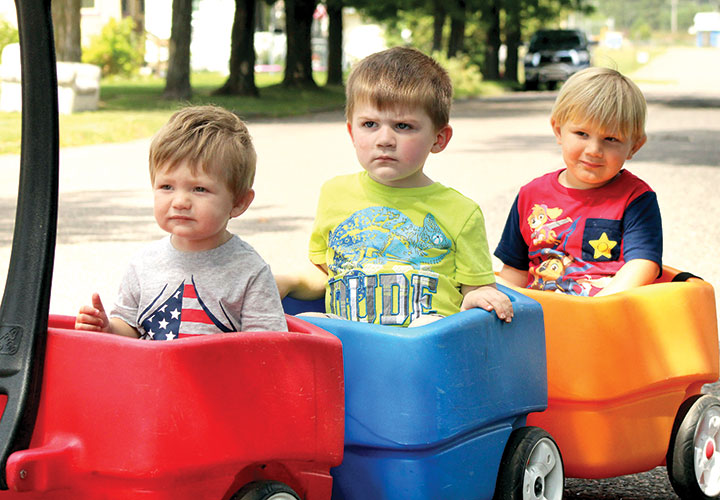 From left, Nixon Walker of Norway, Vincent Perry of Norway and Emil Stanchina of Kingsford take a ride in a wagon train down Lawrence Street in Kingsford. Temperatures should reach the 80s in the region through Saturday, according to the National Weather Service office in Marquette. (Theresa Proudfit/Daily News photo)