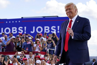 In Mankato, Minnesota, Trump stepped up his rhetoric against Biden, calling him a “puppet of left-wing extremists trying to erase our borders, eliminate our police, indoctrinate our children, vilify our heroes, take away our energy.” Speaking to a crowd of several hundred supporters outside an aircraft hangar, Trump alleged that a Biden victory would “replace American freedom with left-wing fascism.”