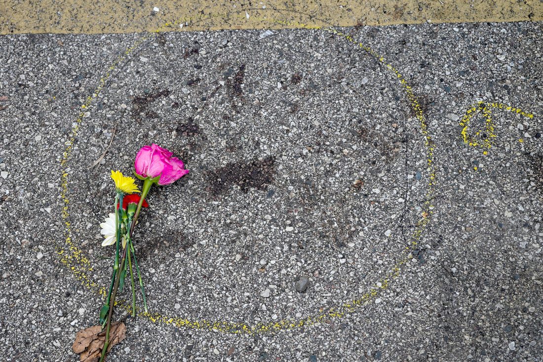 A FLOWER IS placed near some police evidence paint marking blood stains where a protester was shot late Tuesday in Kenosha, Wis. (AP Photo/Morry Gash)