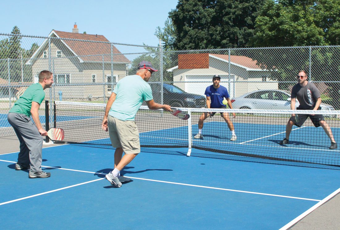 FROM LEFT, BRYCE MONSON, Mark Schinderle, Justin Fila and Derrick Schinderle play pickleball at the Stanton Street courts in Iron Mountain. (Theresa Proudfit/Daily News photo)