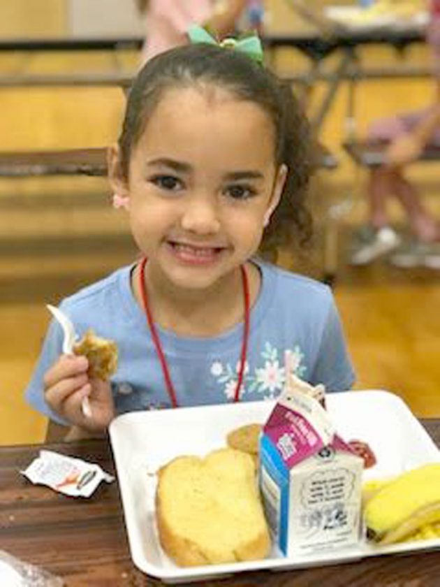 Amahia Torres enjoys her hot lunch in the cafeteria at North Elementary School of the Arts. Amahia is a kindergartener in Mary Brown’s class.