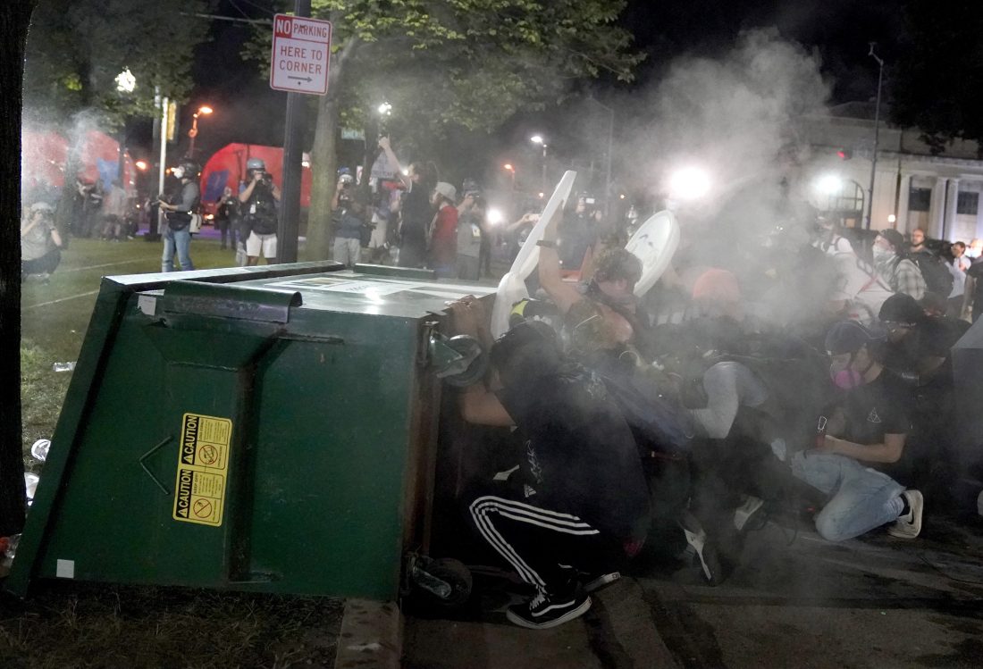 FILE - In this Aug. 25, 2020, file photo, protesters take cover behind a dumpster during clashes with police outside the Kenosha County Courthouse in Kenosha, Wis. (AP Photo/David Goldman, File)