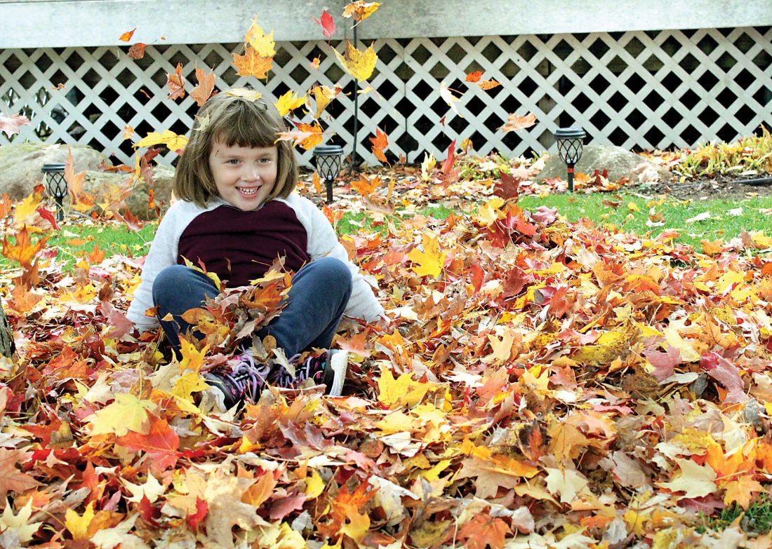 Bella Hood of Iron Mountain plays in a pile of leaves on East C Street. Peak fall colors are expected in the Dickinson County area through the first week of October, according to the Upper Peninsula Travel and Recreation Association.