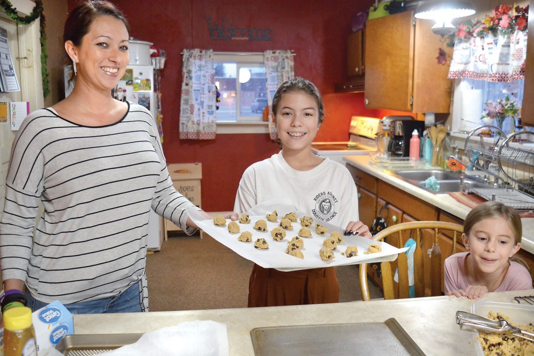 Ella DeRoche, 11, of Florence, has raised nearly $2,000 for the Caring House domestic violence shelter in Iron Mountain by baking and selling chocolate chip cookies. Helping out in the project are her mother, Jesy DeRoche, left, and younger sister, Adalynn, right. “Ella’s Dozen” contains 15 cookies. (Terri Castelaz/Daily News photos)
