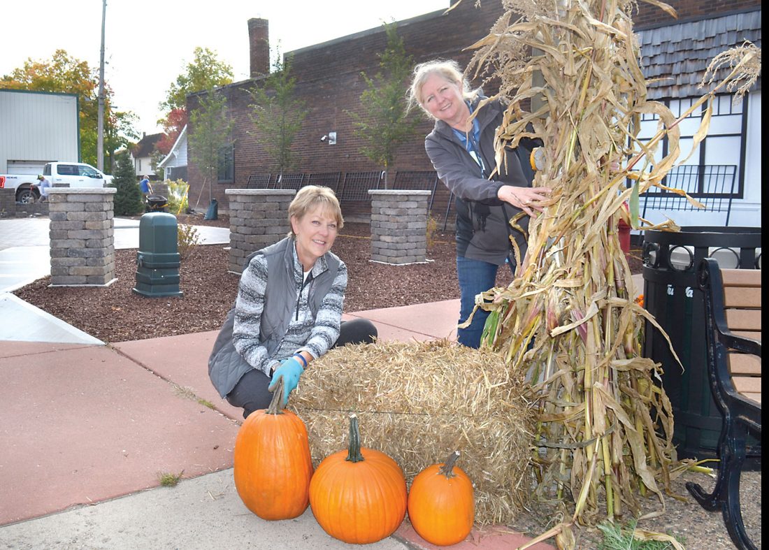 Nancy Sundstrom, left, a Leif Erikson Fall Festival Committee member, and Barb Thorne, owner of the Swedish Passport in Norway and member of the Downtown Development Authority, begin to decorate Main Street in Norway for fall. This year’s festival was cancelled due to COVID-19 concerns. The city of Norway will dedicate two new parks with a ceremony Saturday afternoon. The committee has been involved in the dedication. (Terri Castelaz/Daily News photo)