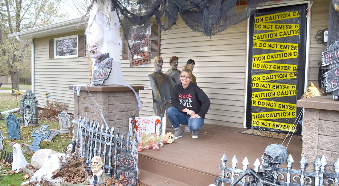 KRISTI ALLEN, 908 Superior Ave. in Kingsford, shows off her Halloween decor. Allen plans to give treats out on Saturday by individually packaging separate bags for the kids. (Terri Castelaz/Daily News photo)
