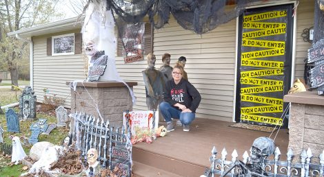 - KRISTI ALLEN, 908 Superior Ave. in Kingsford, shows off her Halloween decor. Allen plans to give treats out on Saturday by individually packaging separate bags for the kids. (Terri Castelaz/Daily News photo)
